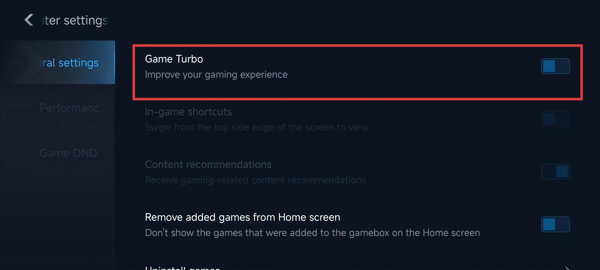 Navigate to the "GameTurbo" section, access its settings,