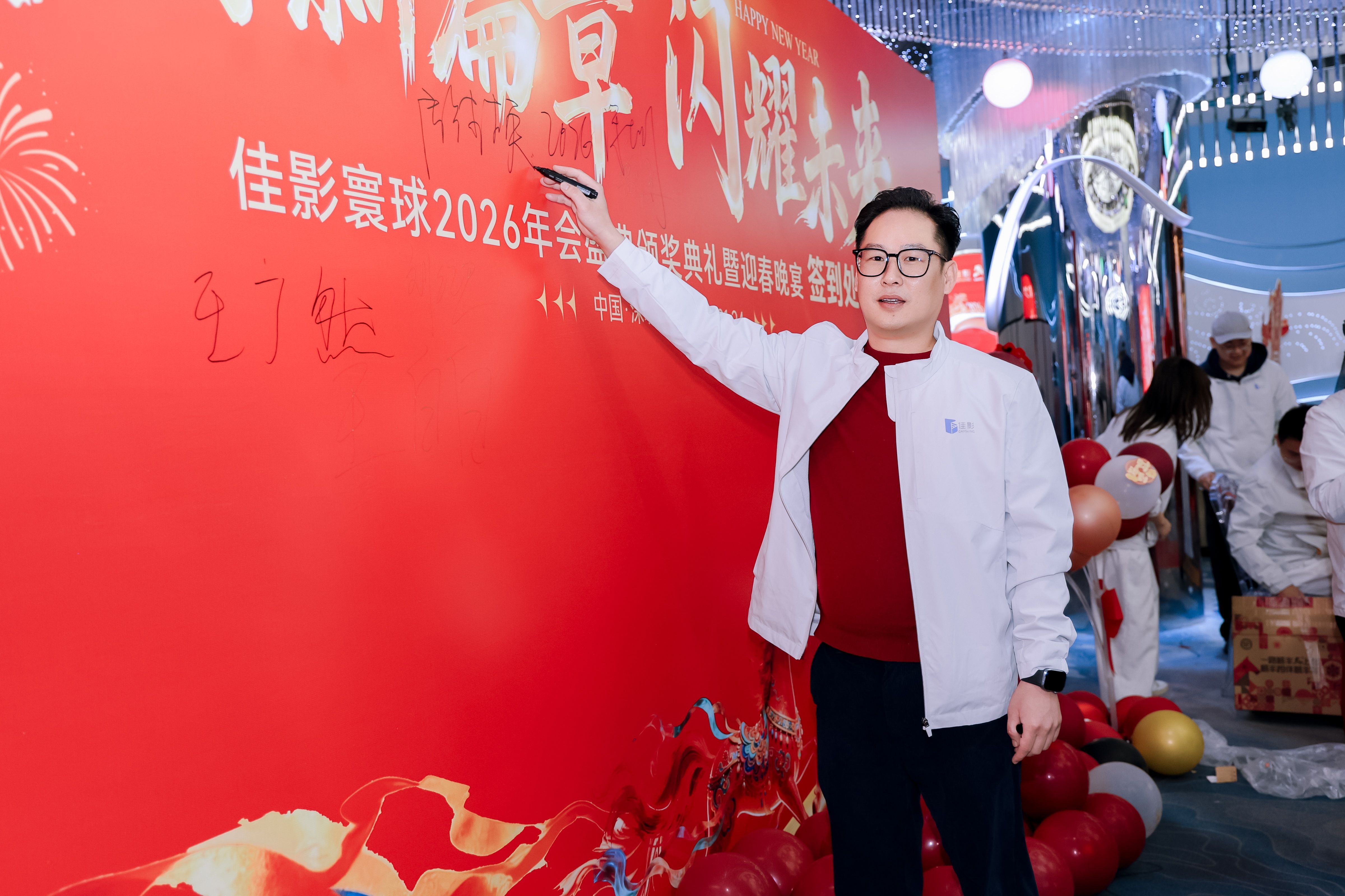 互动过后,嘉宾与员工们前往签名墙完成签到,一笔一划写下名字,定格属于2026年会的专属记忆。大家纷纷驻足合影,笑容里藏着并肩同行的温暖,定格下佳影人同心聚力的珍贵瞬间。