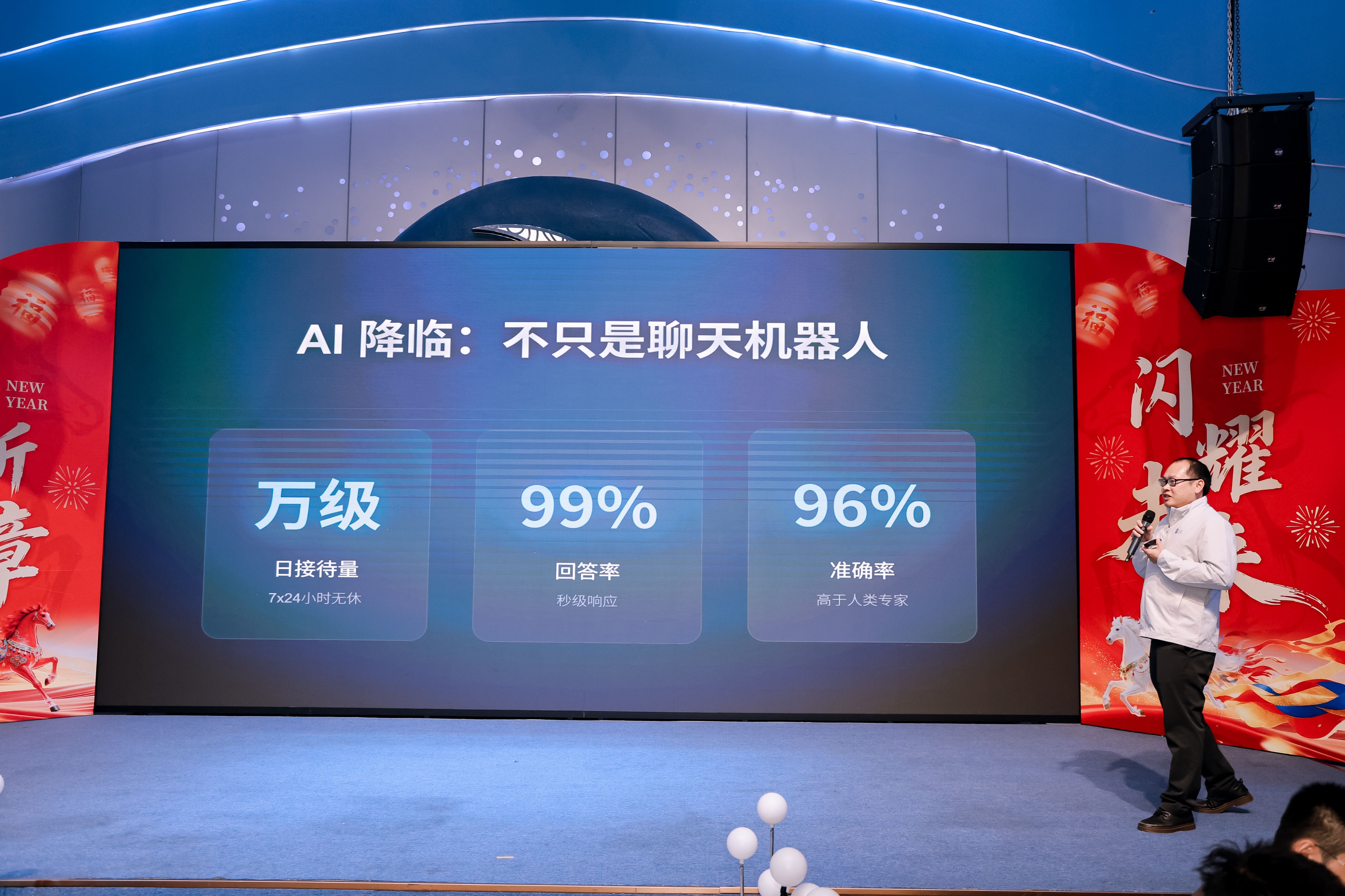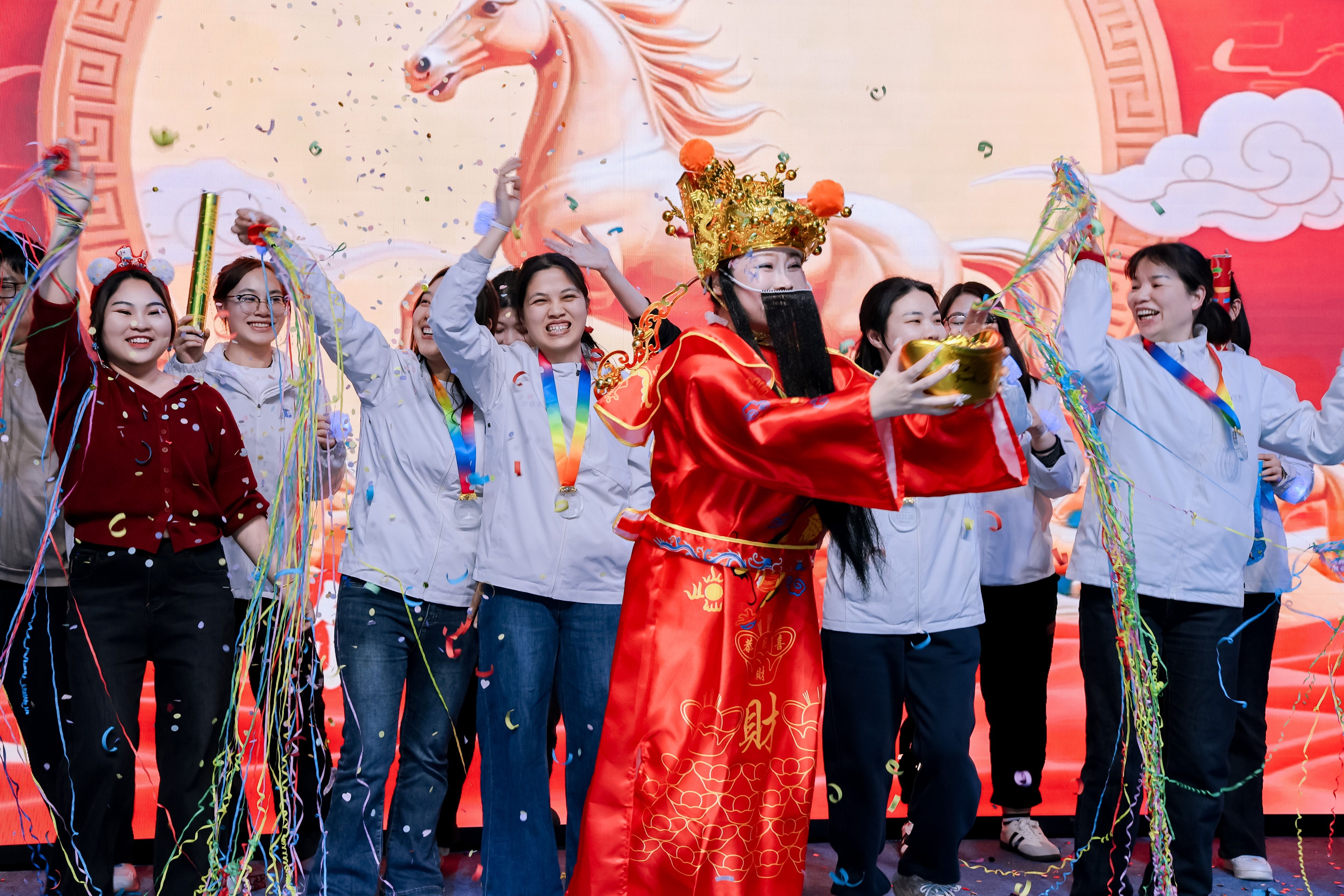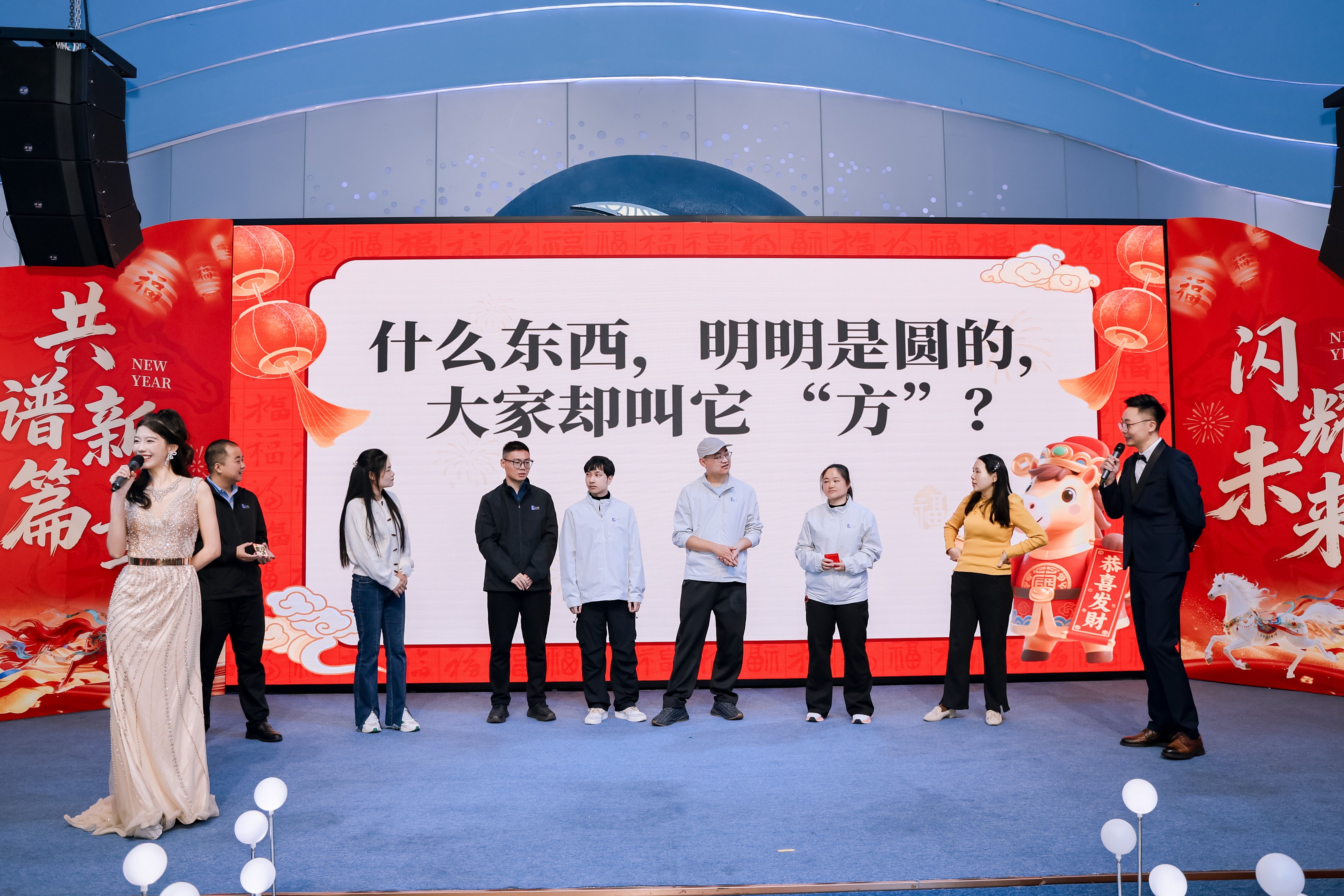 除了重磅环节,年会的暖场互动与节目表演轮番登场,持续点燃现场氛围。暖场阶段,脑筋急转弯、加字造句等趣味小游戏轮番上线,简单有趣的互动让现场快速升温、欢声笑语不断;